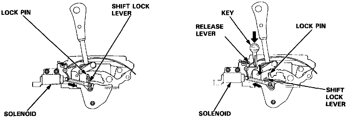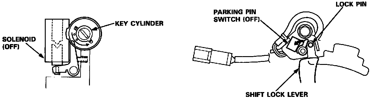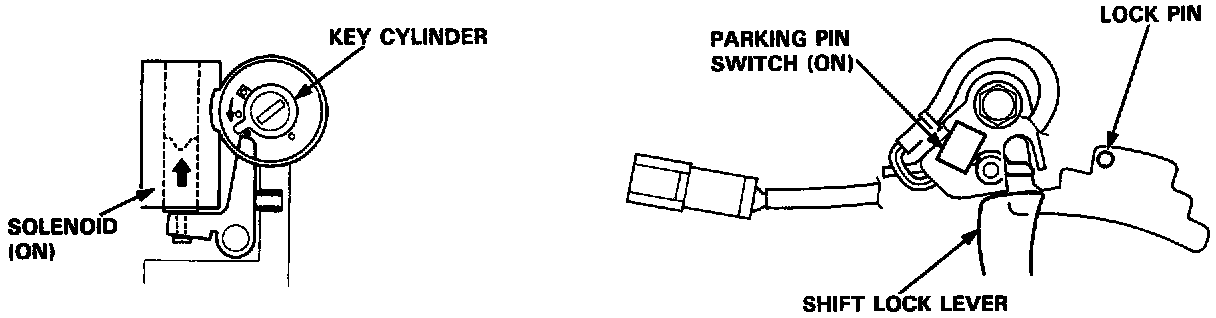 When the shift lever is in any other position than in [P] or is not securely locked in [P] (parking pin switch is ON), a solenoid is activated, making it impossible to remove the ignition key from the ignition switch.