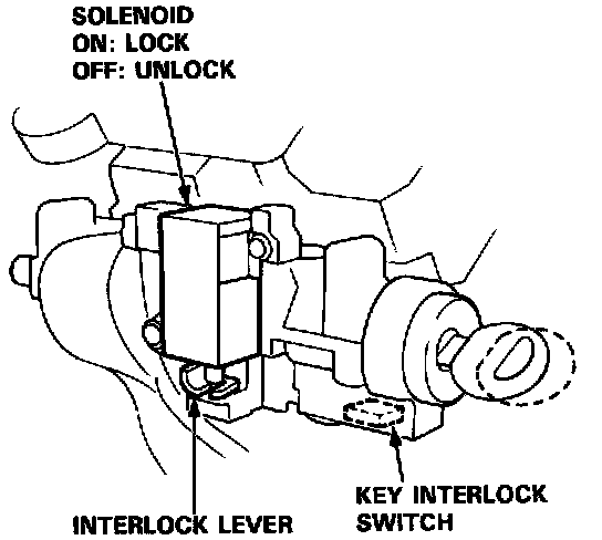 When the A/T gear position switch is in PARK, ground is provided to the key interlock circuit. This removes ground from the interlock solenoid, the solenoid is deenergized, and the key can be removed from the ignition.