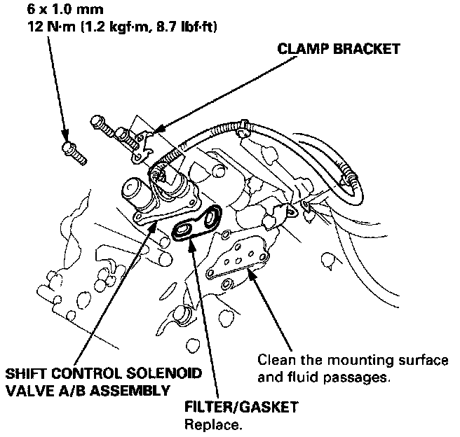 3. Clean the mounting surface and fluid passages of the shift control solenoid valve assembly, and install a new shift control solenoid valve A/B with a new filter/gasket.