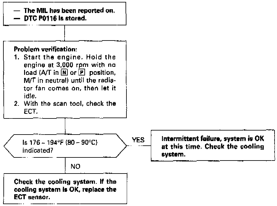 - If DTC P0117 and/or P0118 are stored at the same time as DTC P0116, troubleshoot those DTCs first, then troubleshoot DTC P0116.