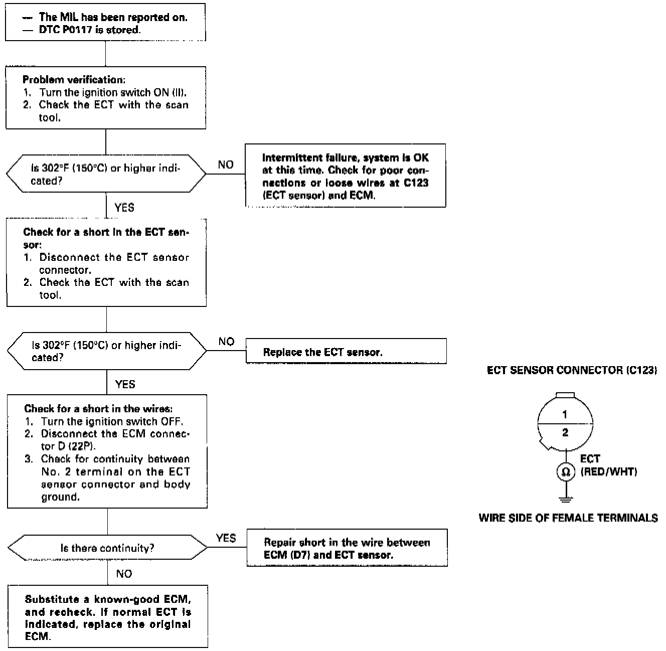 - The scan tool indicates Diagnostic Trouble Code (DTC) P0117: A low voltage (high temperature) problem in the Engine Coolant Temperature (ECT) sensor circuit.