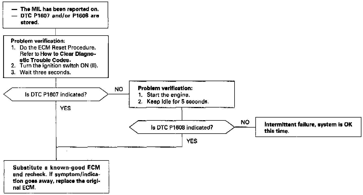 The scan tool indicates Diagnostic Trouble Code (DTC) P16O7: An ECM Internal Circuit Failure A.