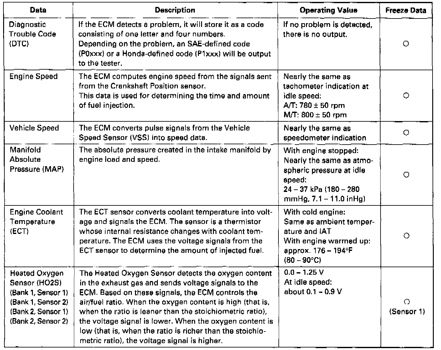 By connecting the OBD-II scan tool or the Honda PGM Tester to the 16P data link connector (DLC), various data can be retrieved from the ECM. The items listed in the table below conform to the SAE recommended practice.