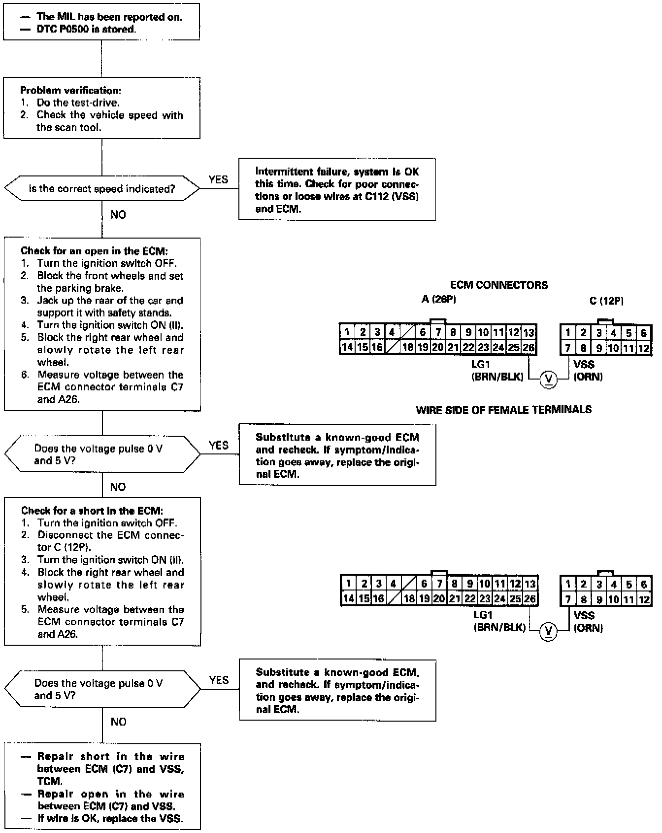 The scan tool indicates Diagnostic Trouble Code (DTC) P0500: A low voltage problem in the Vehicle Speed Sensor (VSS) circuit.