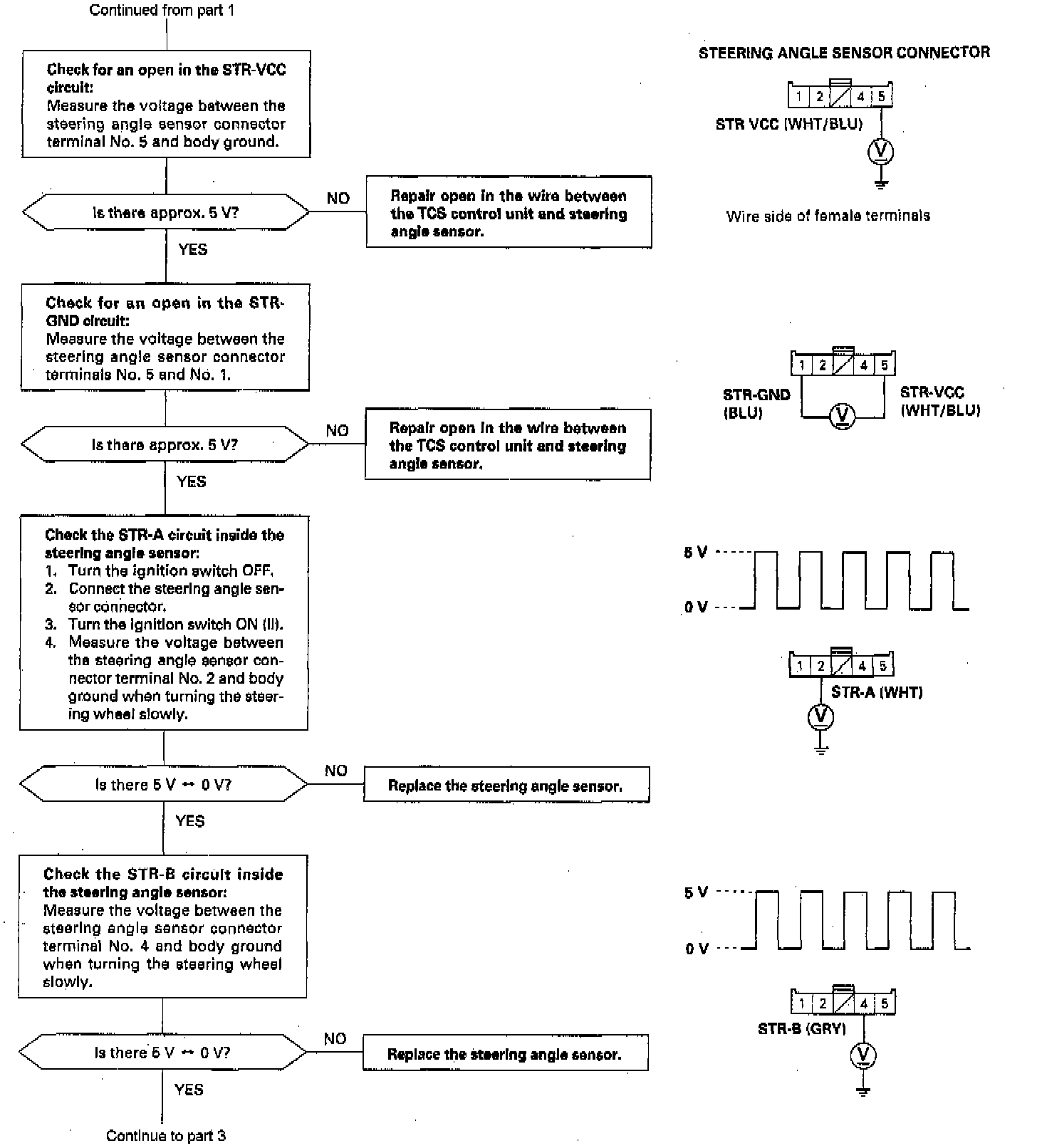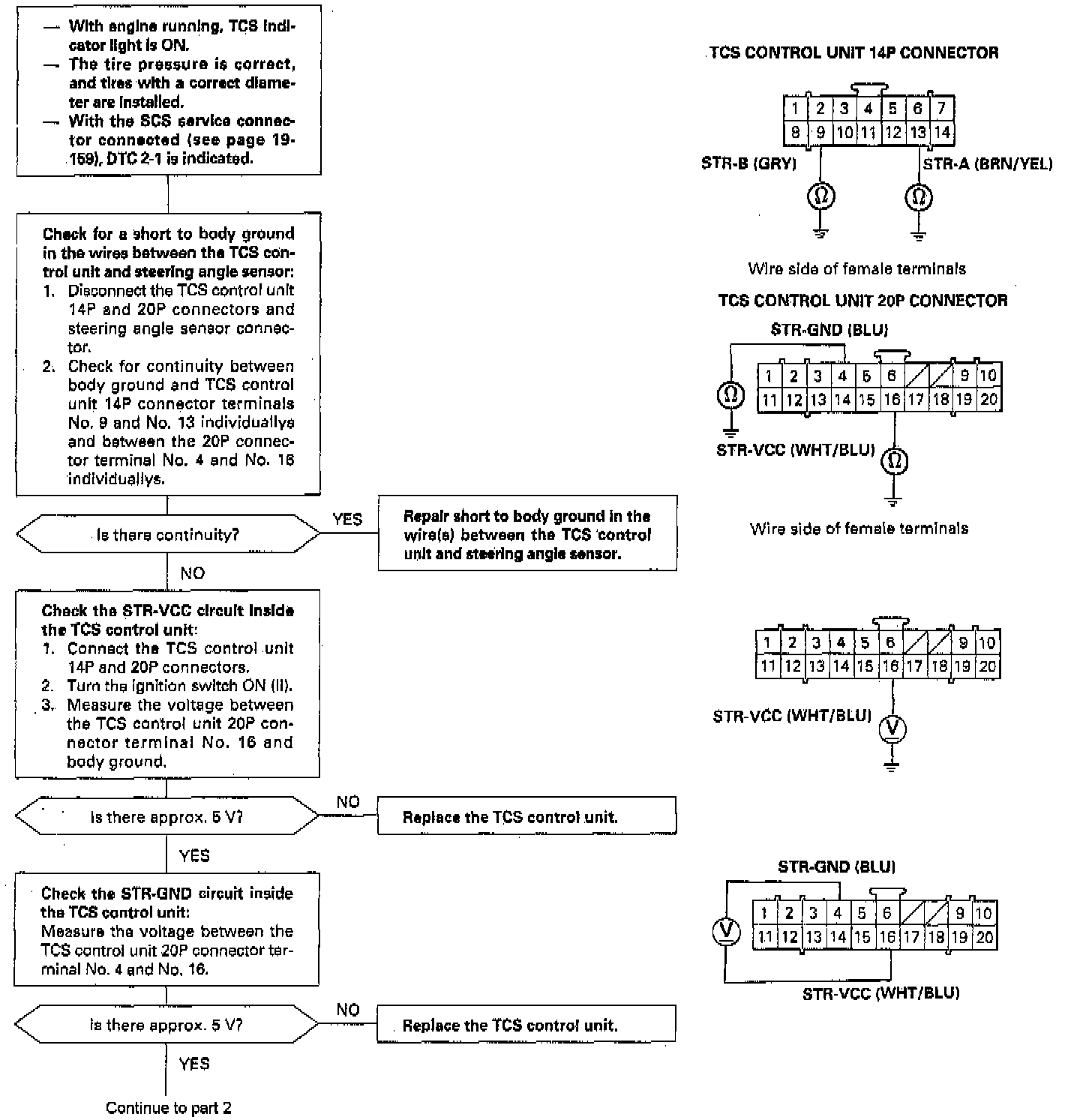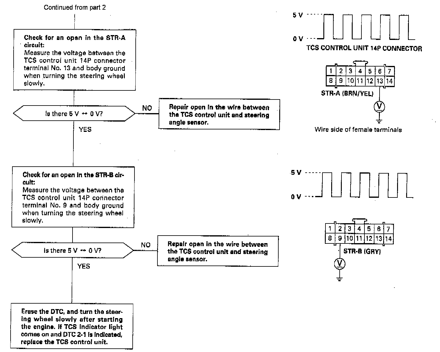 Diagnostic Trouble Code (DTC) 2-1: Steering Angle Sensor DiagnosisThe Traction Control System (TCS) control unit performs the self-diagnosis for the steering angle sensor when the speed of the four wheels exceeds 6 mph (10 km/h) on a smooth road. The TCS indicator light comes on if a yaw rate is generated, the corresponding steering angle signal is not input when the steering wheel is turned, and there is no input from the STOP (brake switch signal) and PARK (parking brake switch signal).