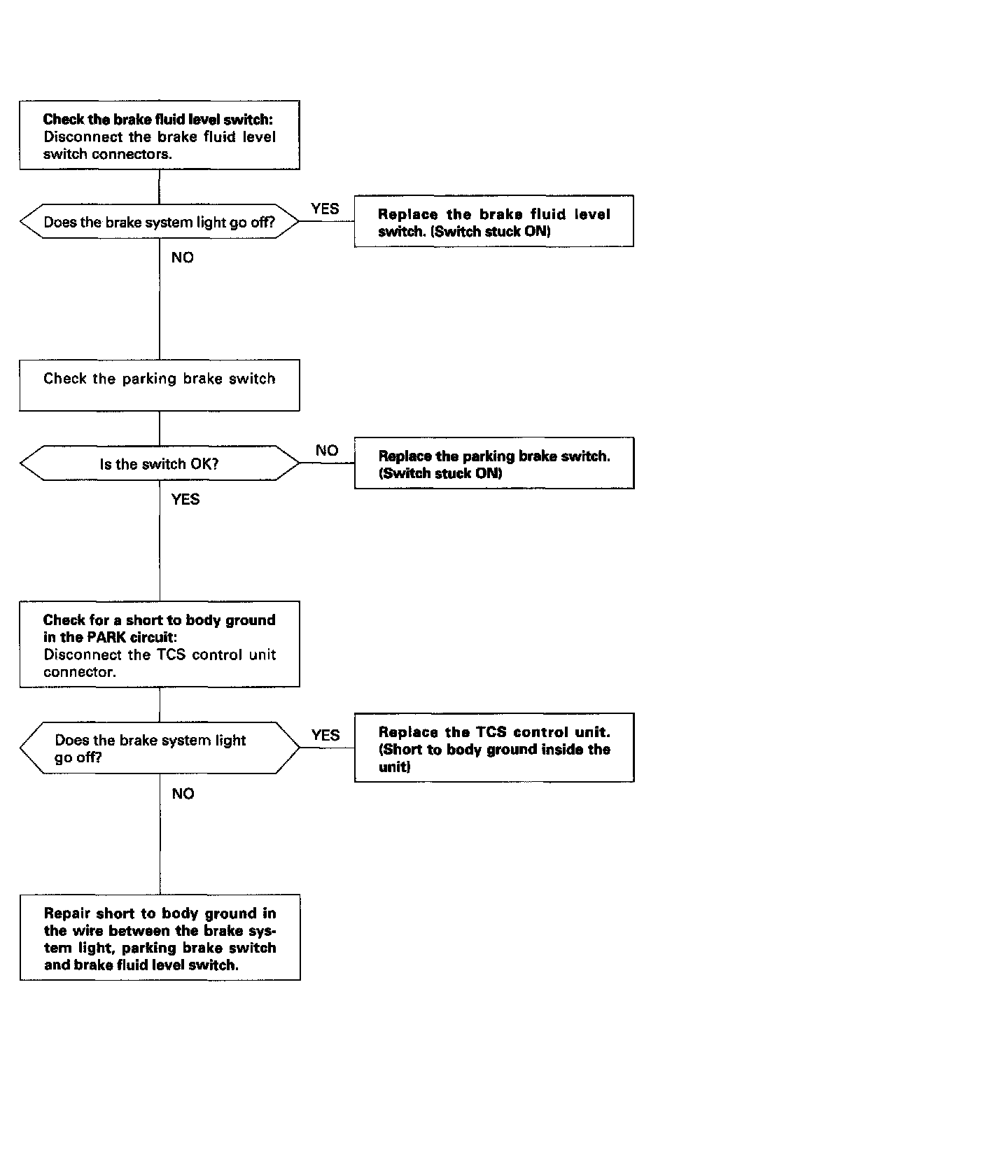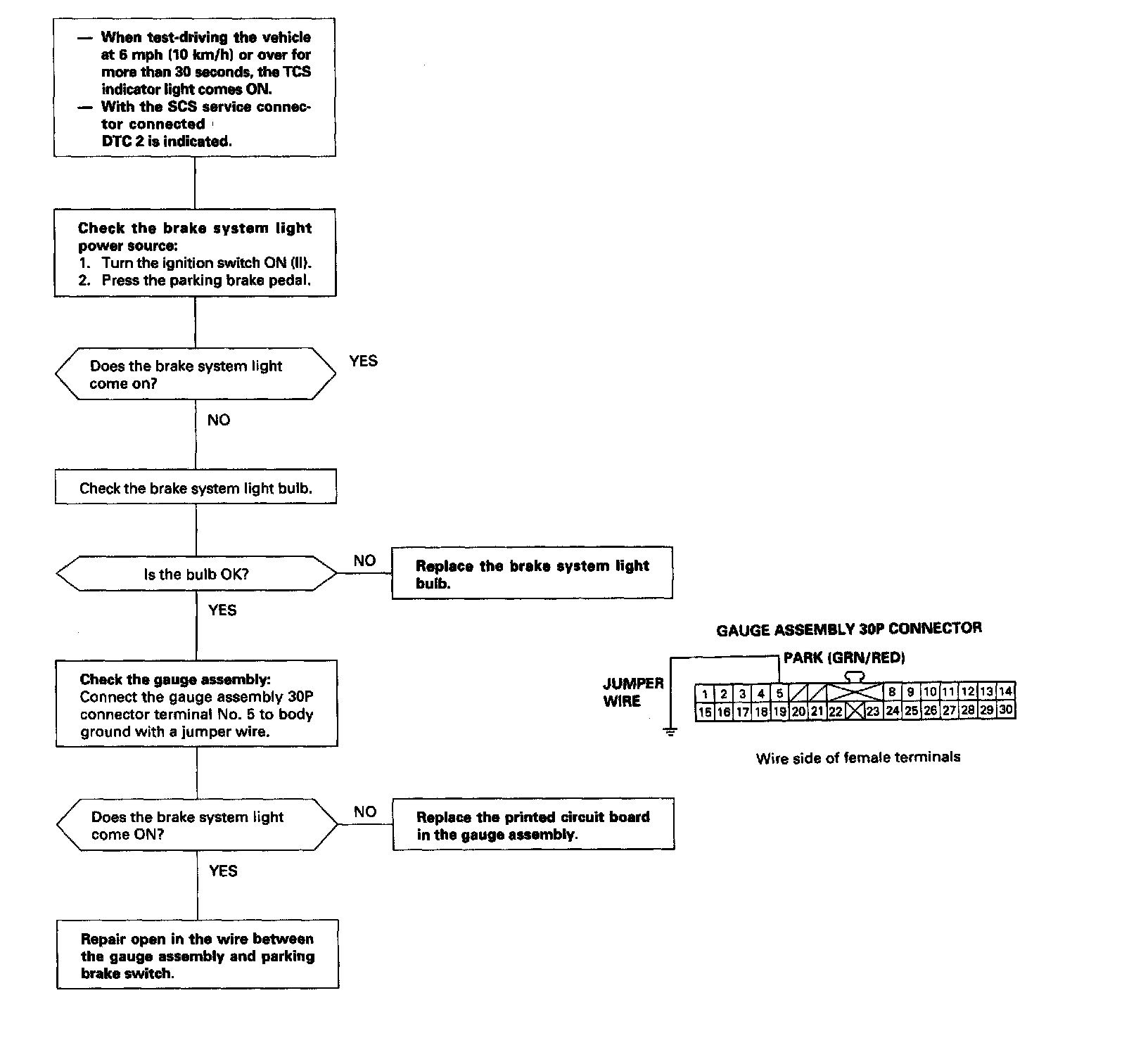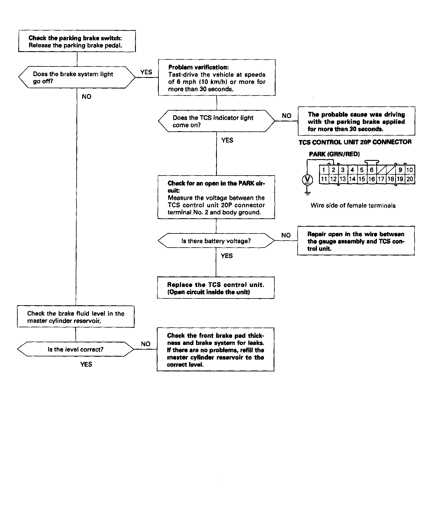 When the rear wheel speed is 6 mph (10 km/h) or more and the parking brake is applied for more than 30 seconds continuously, the TCS control unit causes the TCS indicator light to come on.