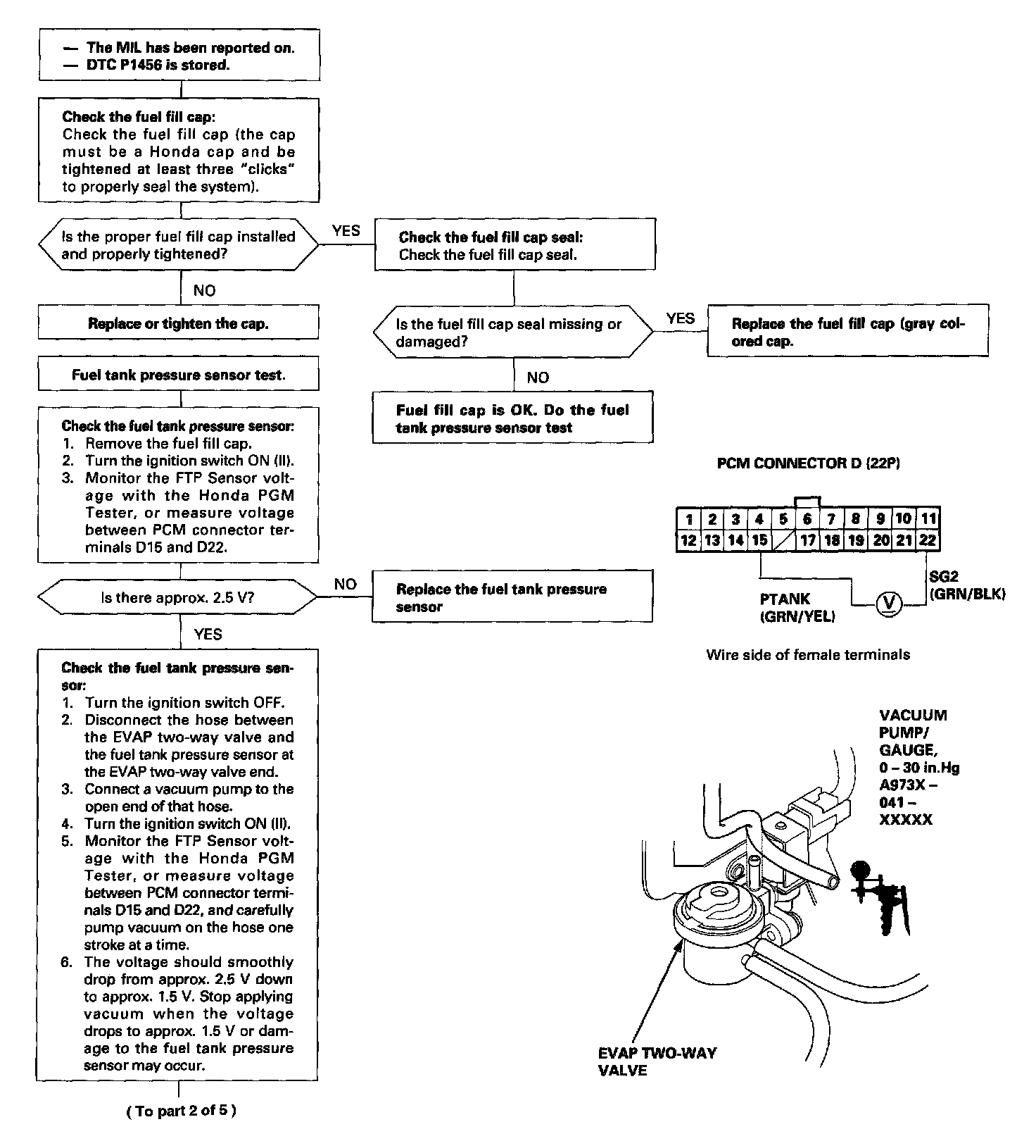 The scan tool indicates Diagnostic Trouble Code (DTC) P1456: Evaporative Emission (EVAP) control system leak detected (fuel tank system).