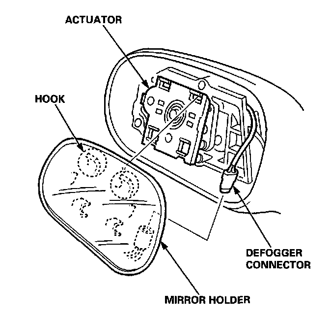 2. Detach the hooks, disconnect the defogger connector (if so equipped), then remove the mirror holder from the actuator.