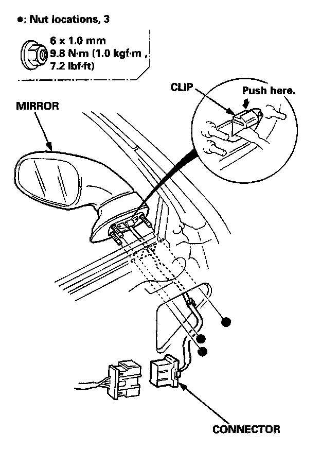 3. Disconnect the connector, and detach the clip. Remove the nuts, detach the clip, then remove the mirror while holding it.