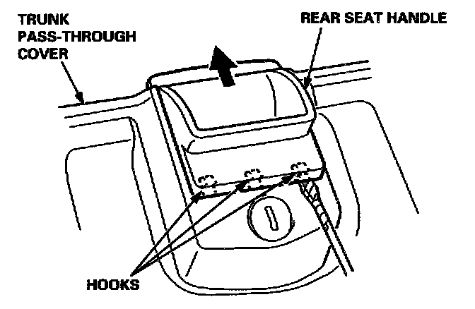 1. Using a flat-tip screwdriver, pry the rear seat handle up at either hook portion on forward side of the trunk pass through cover. Then slide the handle half-way up.