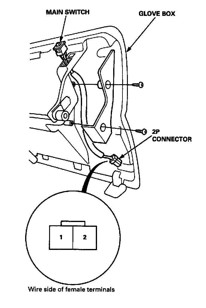 1. Remove the glove box.2. Disconnect the 2P connector from the main switch.