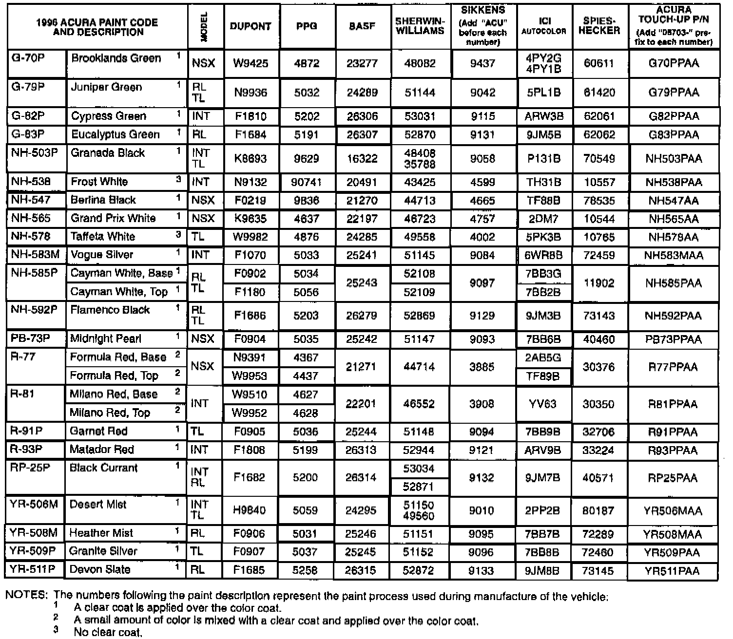 1996 Acura SLX Paint Codes