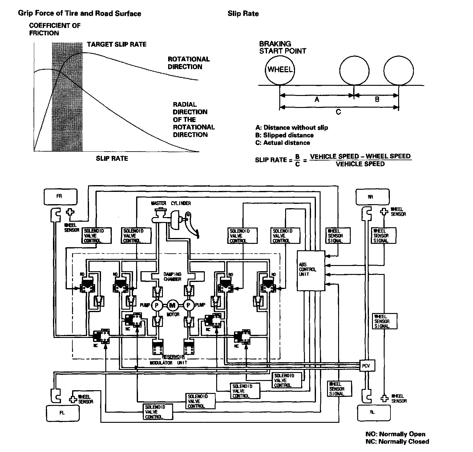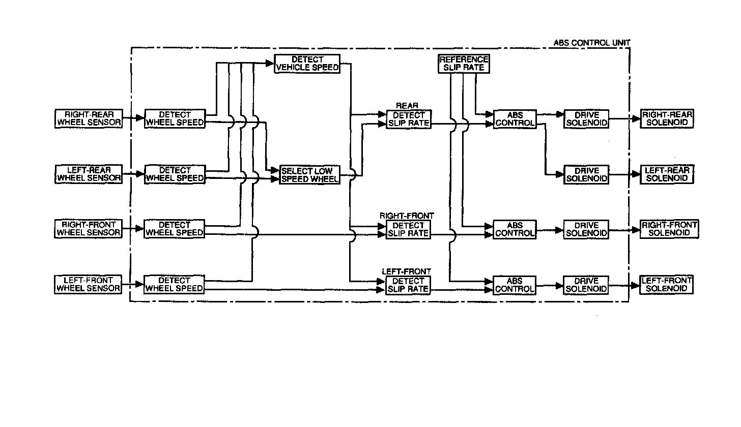 When the brake pedal is pressed during driving, the wheels can lock before the vehicle comes to a stop. In such an event, the maneuverability of the vehicle is reduced if the front wheels are locked, and the stability of the vehicle is reduced if the rear wheels are locked, creating an extremely unstable condition. The ABS precisely controls the slip rate of the wheels to ensure maximum grip force from the tires, and it thereby ensures maneuverability and stability of the vehicle. The ABS calculates the slip rate of the wheels based on the vehicle speed and the wheel speed, then it controls the brake fluid pressure to attain the target slip rate.
