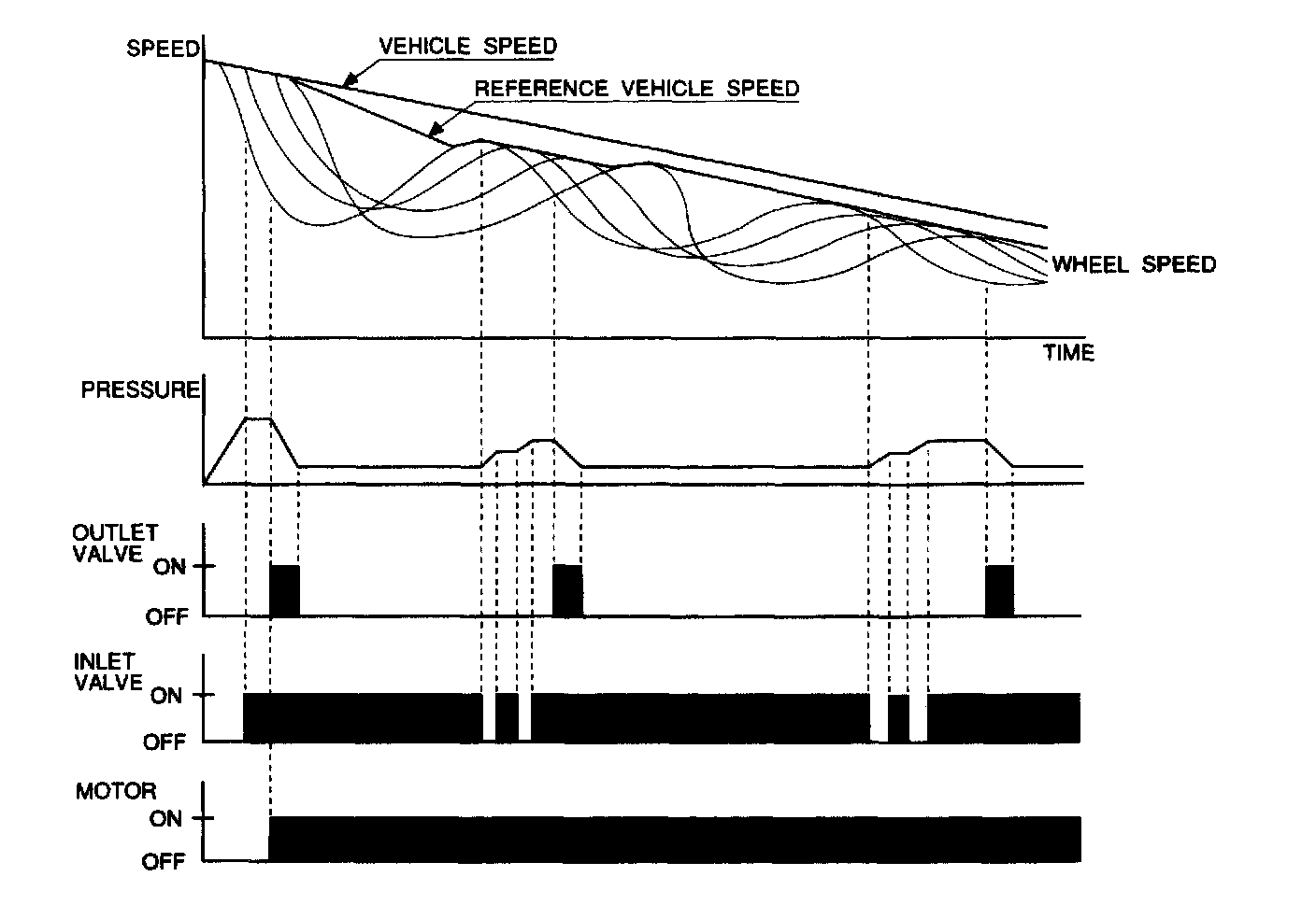 When the wheel speed drops sharply below the vehicle speed, the inlet valve closes to retain the caliper fluid pressure.