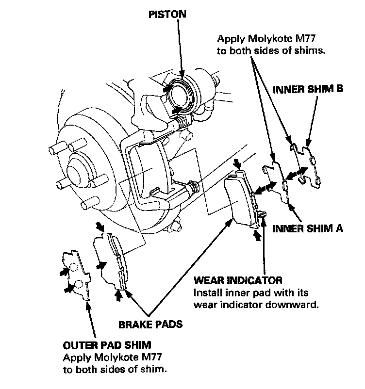 NOTE: Use the pad grease included in the pad set or Molykote M77 grease, and apply a thin coat of grease evenly to the designated points.