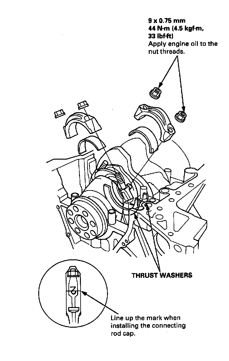 6. Check the connecting rod bearing clearance with plastigage, then torque the connecting rod cap nuts.