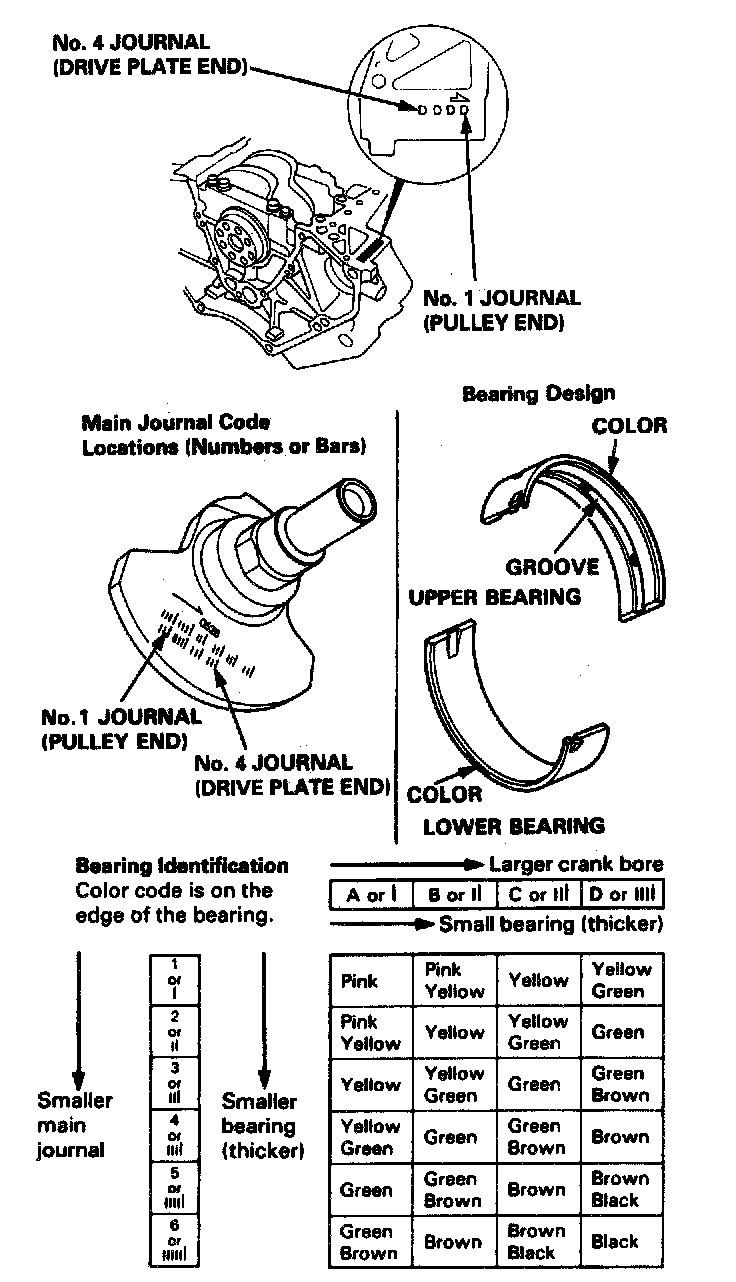 Letters or bars have been stamped on the end of the cylinder block as a code for the size of each of the four main journal bores. Use them, and the numbers or bars stamped on the crankshaft (codes for main journal size), to choose the correct bearings.