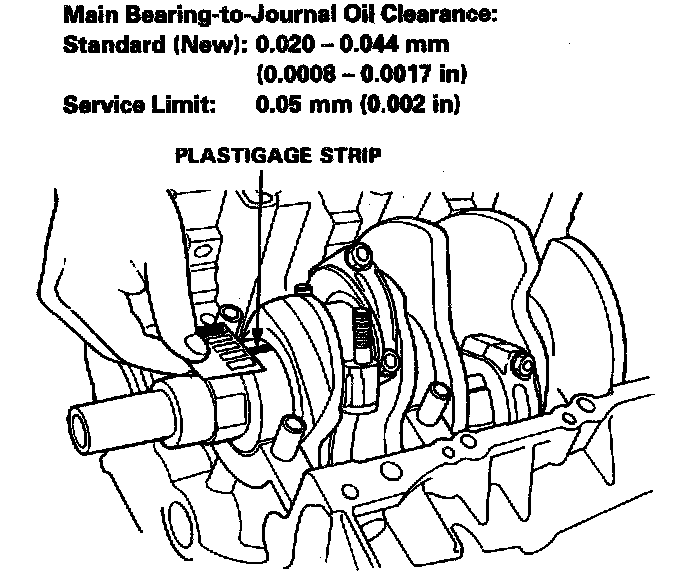 NOTE: If the engine is still in the vehicle when you bolt the main cap down to check clearance, the weight of the crankshaft and flywheel will flatten the plastigage further than just the torque on the cap bolts, and give you an incorrect reading. For an accurate reading, support the crankshaft with a jack under the counterweights and check only one bearing at a time.