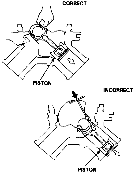 10. Remove the connecting rod caps after setting the crank pin at BDC for each cylinder. Remove the piston assembly by pushing on the connecting rod.