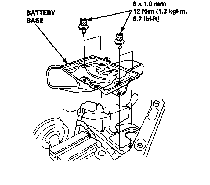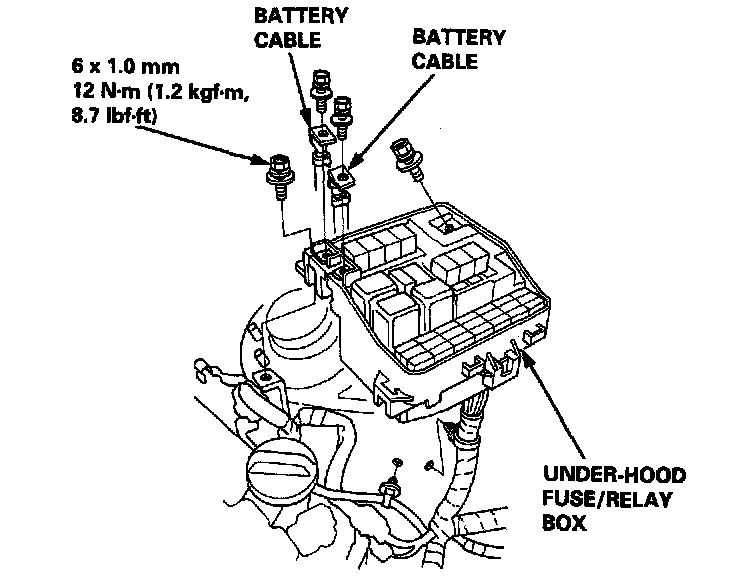 13. Remove the battery cables from the under-hood fuse/relay box, then remove the under-hood fuse/ relay hey