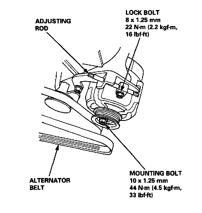 18. Loosen the mounting bolt, lock bolt and adjusting rod, then remove the alternator belt.