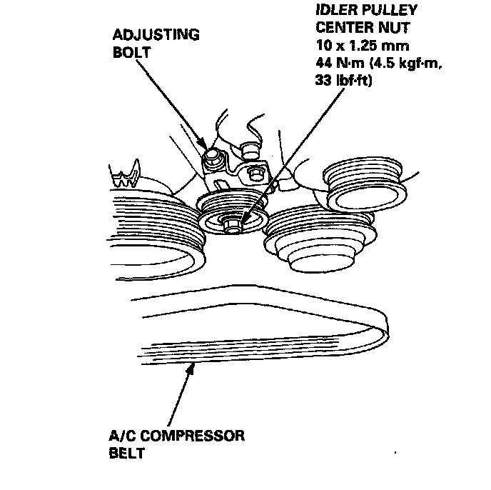 19. Loosen the idler pulley center nut and adjusting bolt, then remove the air conditioning (A/C) compressor belt.