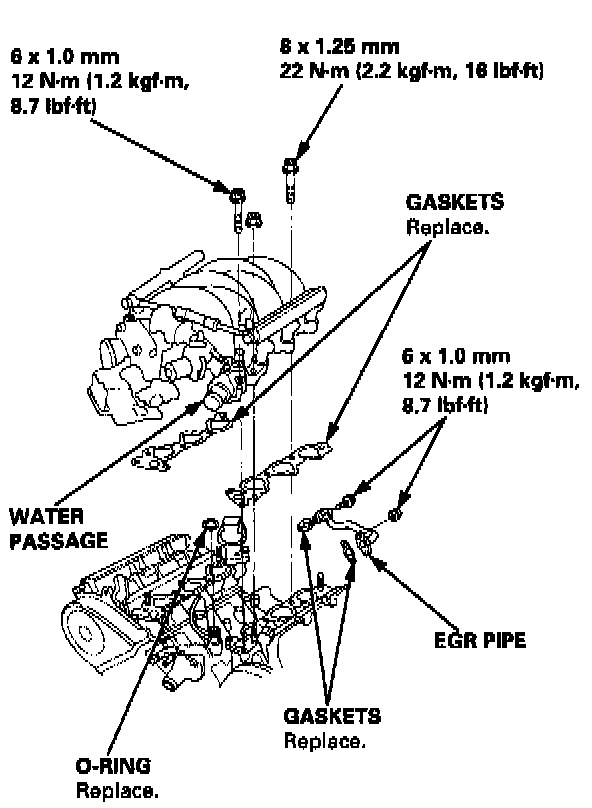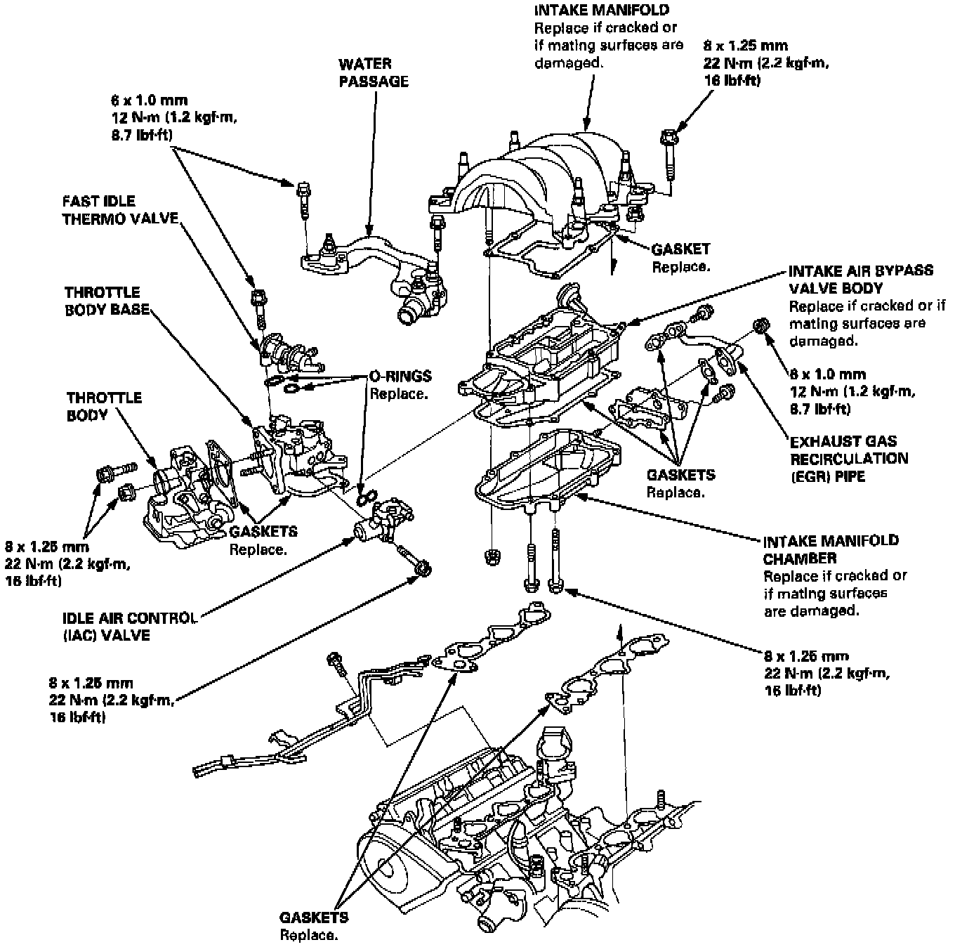 Tighten the intake manifold mounting bolts and nuts in a crisscross pattern in two or three steps, beginning with the inner bolts.