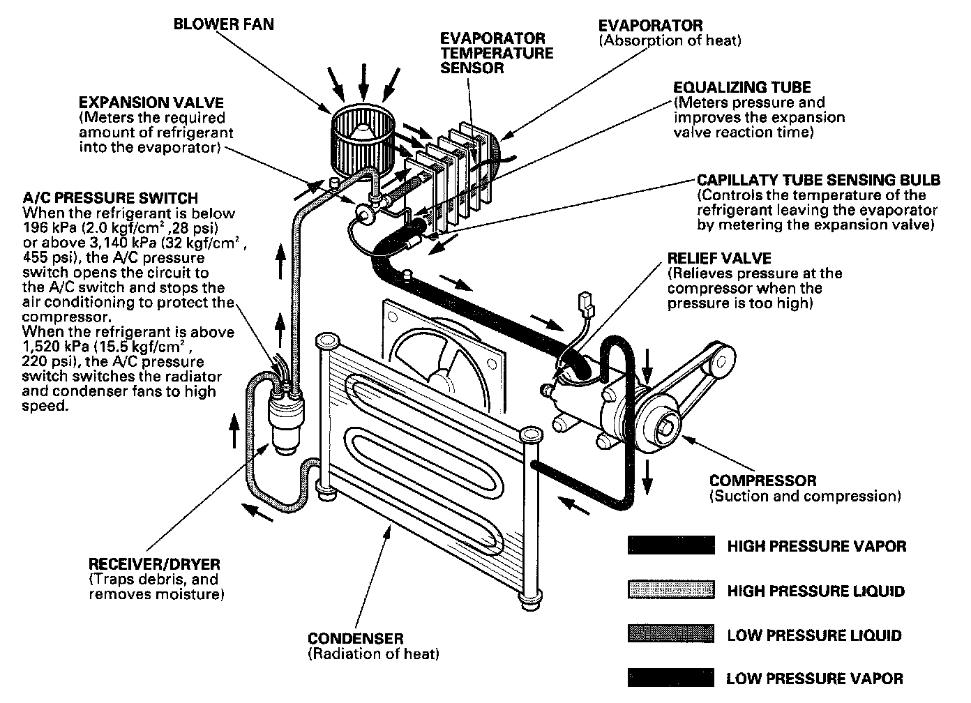 OutlineThe air conditioning system removes heat from the passenger compartment by circulating refrigerant through the system as shown.