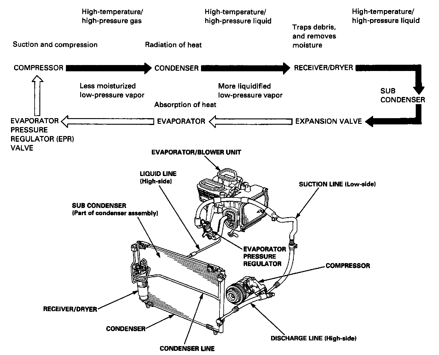 OutlineThe air conditioner system removes heat from the passenger compartment by circulating refrigerant through the system as shown.