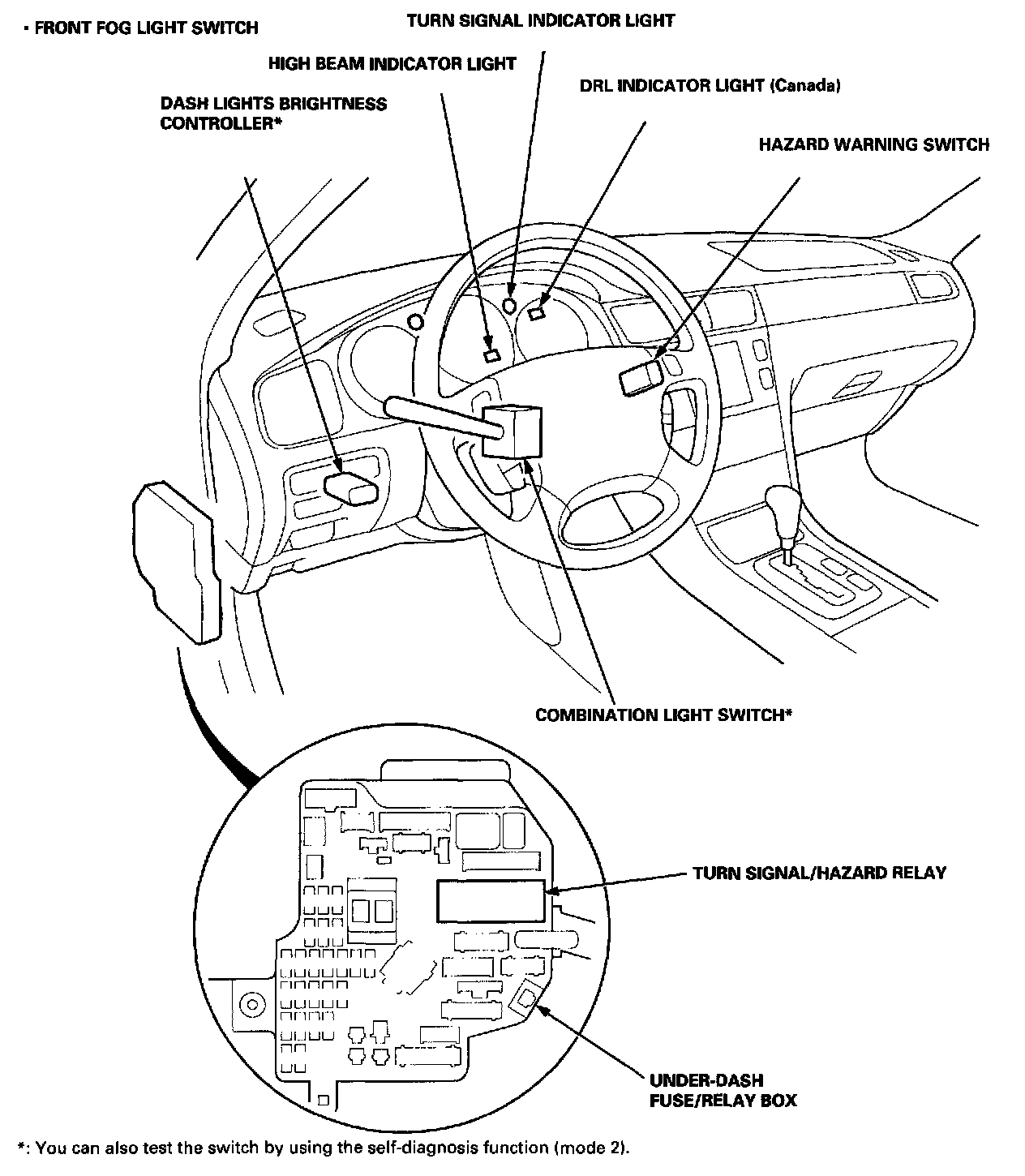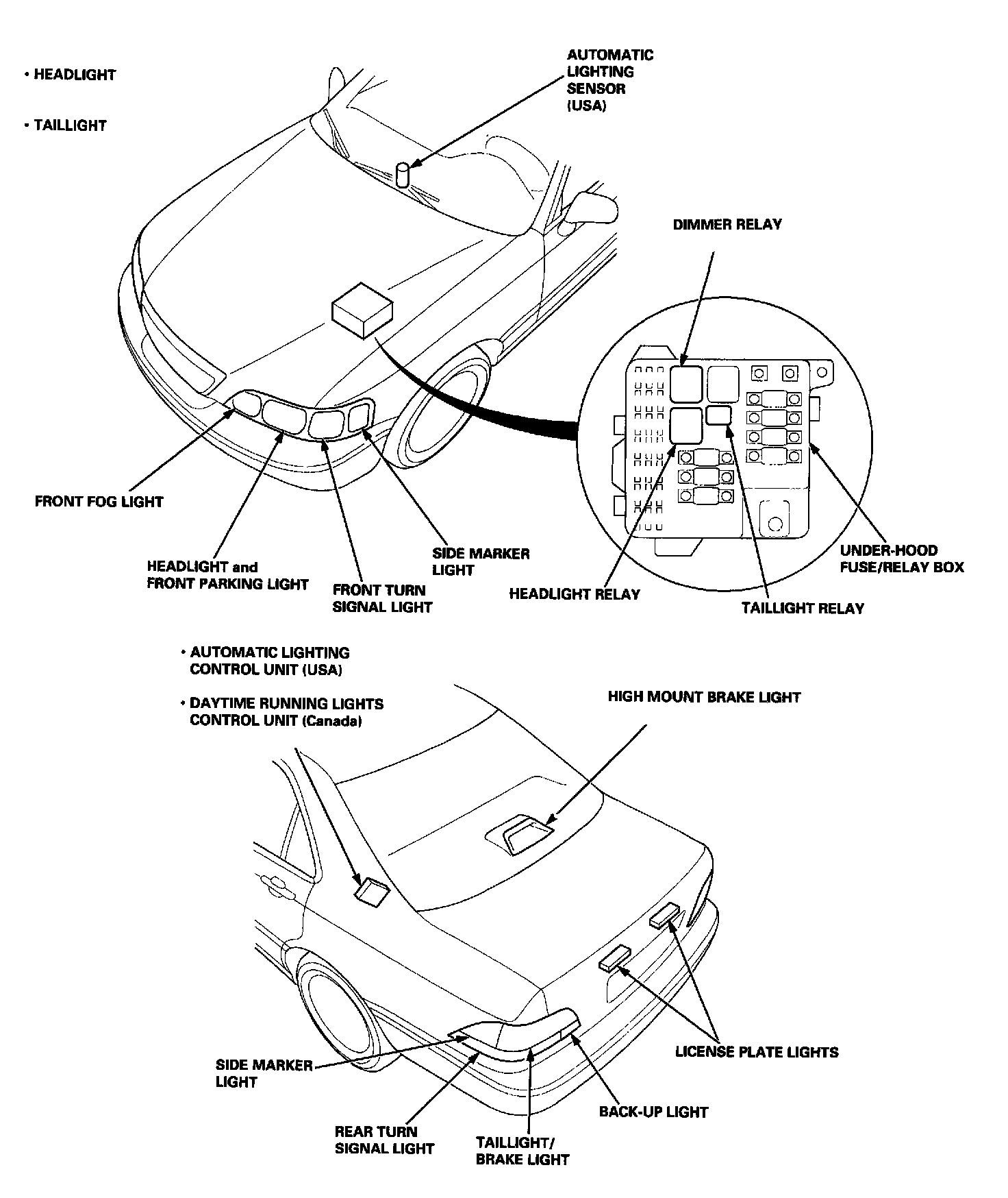 Automatic Lighting System: When the combination light switch is in the "AUTO" position, the automatic lighting control unit turns ON the headlights, all other exterior lights, and the instrument panel lights when the ambient light is low. The control unit receives signals from the automatic lighting sensor, which senses the lux (illumination) level outside the vehicle, and it controls the lights by means of the lighting relay and taillight relay.