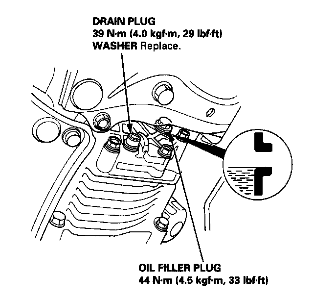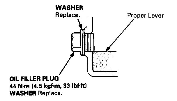 2. The oil level must be up to the fill hole. If it is below the hole, add oil until it runs out, then reinstall the oil filler plug with a new washer.