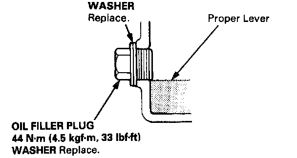 2. The oil level must be up to the fill hole. If it is below the hole, add oil until it runs out, then reinstall the oil filler plug with a new washer.