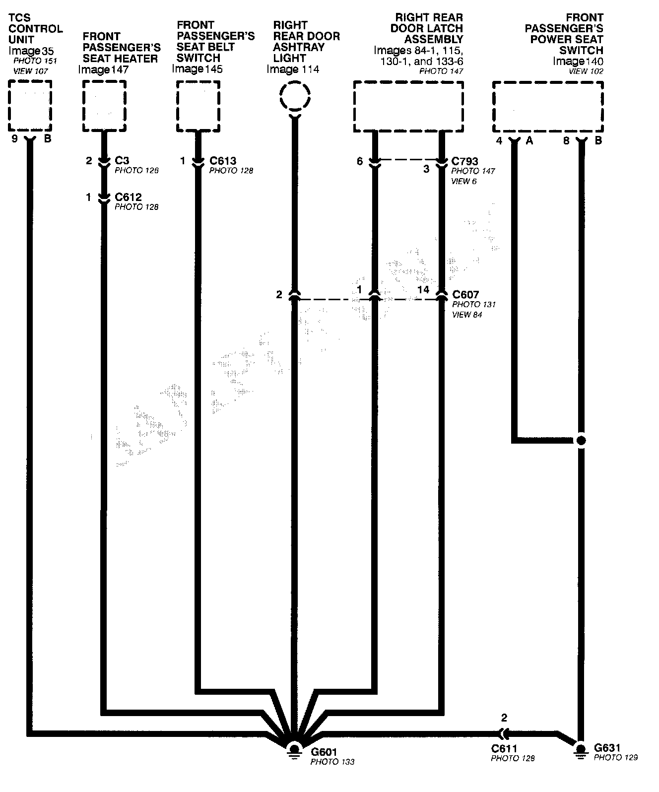 This sample Ground Distribution schematic shows all of the components that share two ground points.