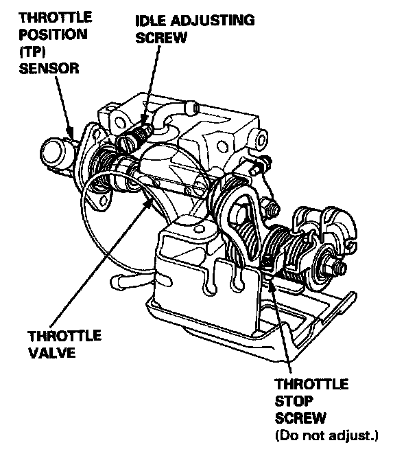 The throttle body is a single-barrel side-draft type. The lower portion of the throttle valve is heated by engine coolant from the cylinder head. The idle adjusting screw, which increases/decreases bypass air, and the Evaporative Emission (EVAP) Canister port are located on the top of the throttle body.