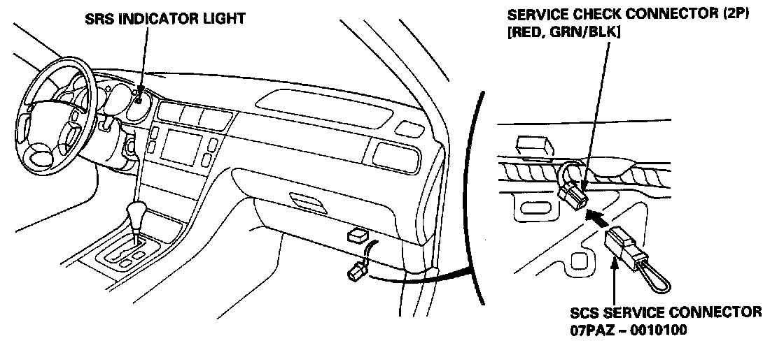 Special Tools Required: SCS Service Connector 07PAZ - 00101001. Turn the ignition switch OFF, and wait for ten seconds. Then connect the SCS service connector to the service check connector (2P). If you do not wait ten seconds, the SRS unit will not be completely reset and will not output DTCs.