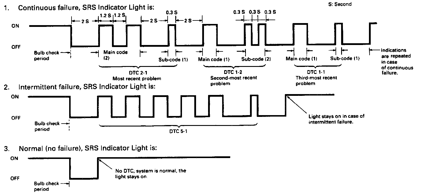 - In case of an intermittent failure, the SRS indicator light will indicate the DTC one time, then it will stay on (see example 2 in fig).