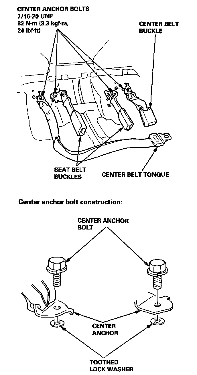 2. Remove the center anchor bolts, then remove the seat belt buckles and center belt tongue.