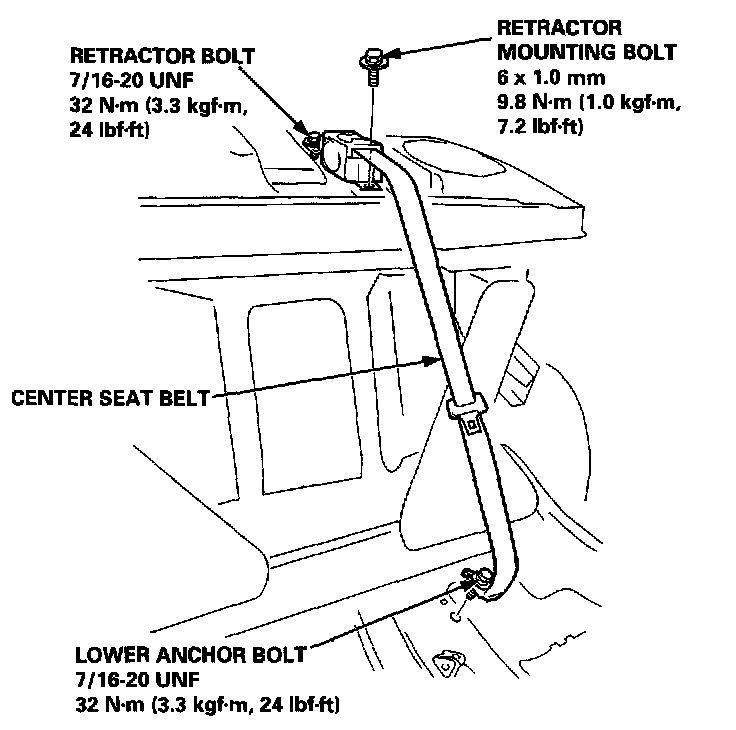 2. Remove the retractor mounting bolt, retractor bolt and lower anchor bolt, then remove the center seat belt.