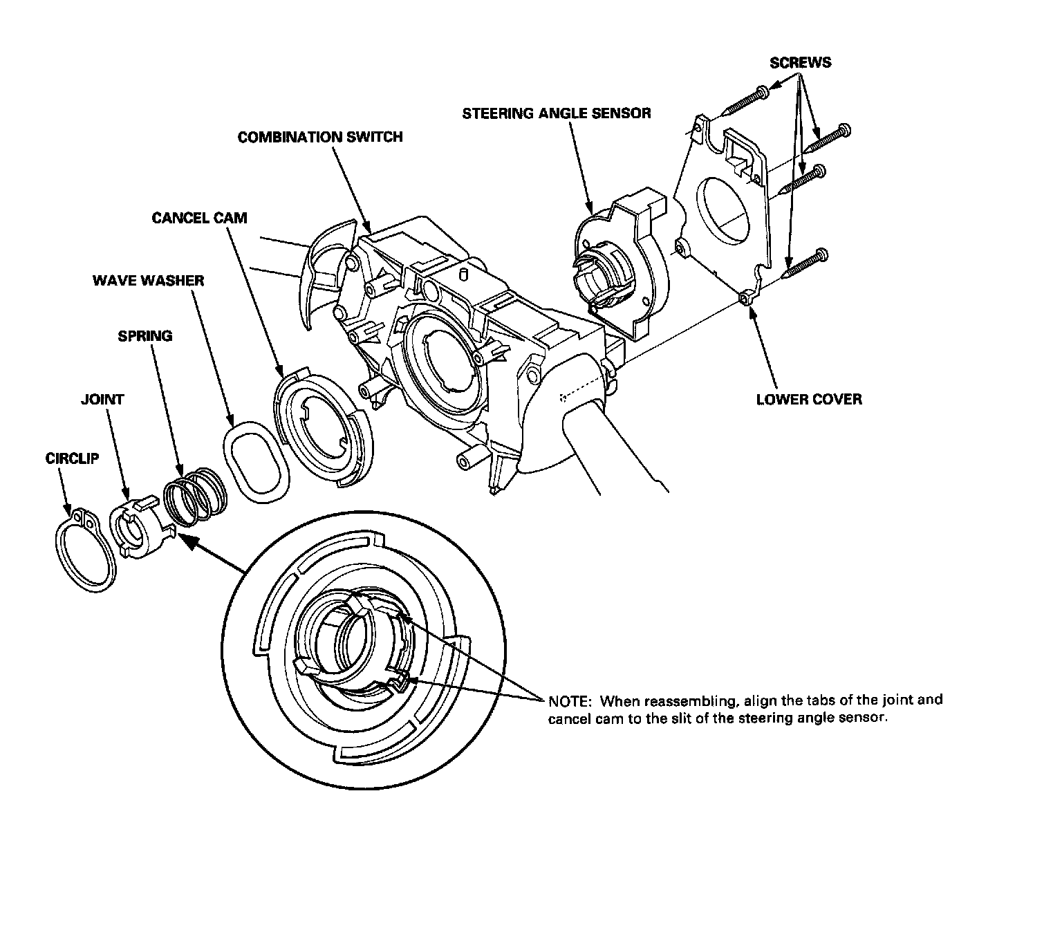2. Remove the circlip and screw, then remove the steering angle sensor from the combination switch.