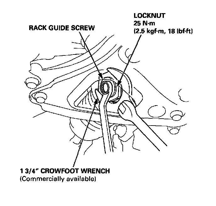 2. Tighten the rack guide screw to 25 Nm (2.5 kgf-m, 18 ft. lbs.), then loosen it.