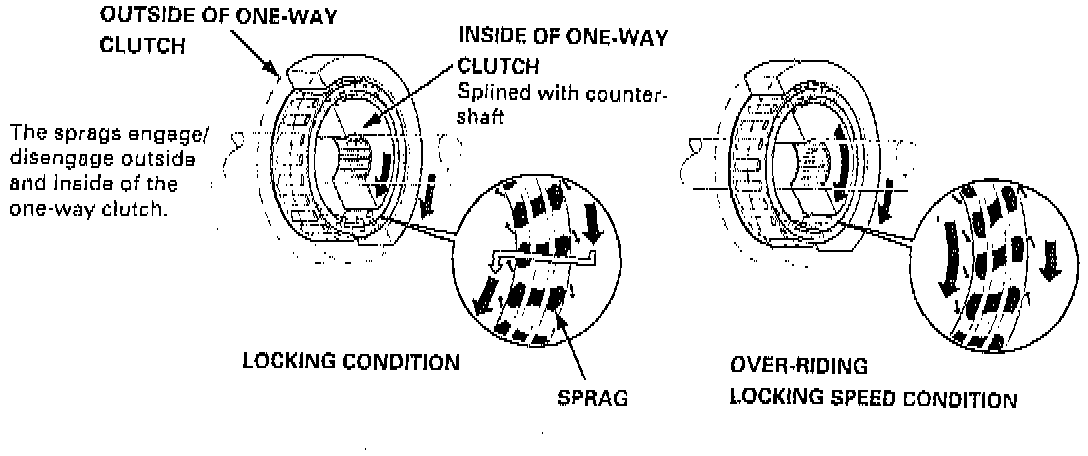 This transmission has two one-way clutches: the 1st gear one-way clutch and the 2nd gear one-way clutch. The 1st gear one-way clutch is positioned between the countershaft 1st gear and the one-way clutch hub, with the one-way clutch hub splined to the countershaft 2nd gear. The countershaft 1st gear provides the outer race surface, and the one-way clutch hub provides the inner race surface. The 2nd gear one-way clutch is positioned between the countershaft 2nd gear and the parking gear, with the parking gear splined to the countershaft. The countershaft 2nd gear provides the outer race surface, and the parking gear provides the inner race surface. The one-way clutches lock up when power is transmitted from the mainshaft 1st gear to the countershaft 1st gear. The 2nd gear one-way clutch locks up when power is transmitted from the mainshaft 2nd gear to the countershaft 2nd gear. The 1st clutch and gears remain engaged in the 1st, 2nd, 3rd, and 4th gear positions in the D3 or D4 position. However, the 1st gear one-way clutch disengages when the 2nd, 3rd, or 4th clutches/gears are applied in the D3 or D4 position. This is because the increased rotational speed of the gears on the countershaft over-ride the locking "speed range" of the one-way clutch. Thereafter, the one-way clutch freewheels with the 1st clutch still encaged.