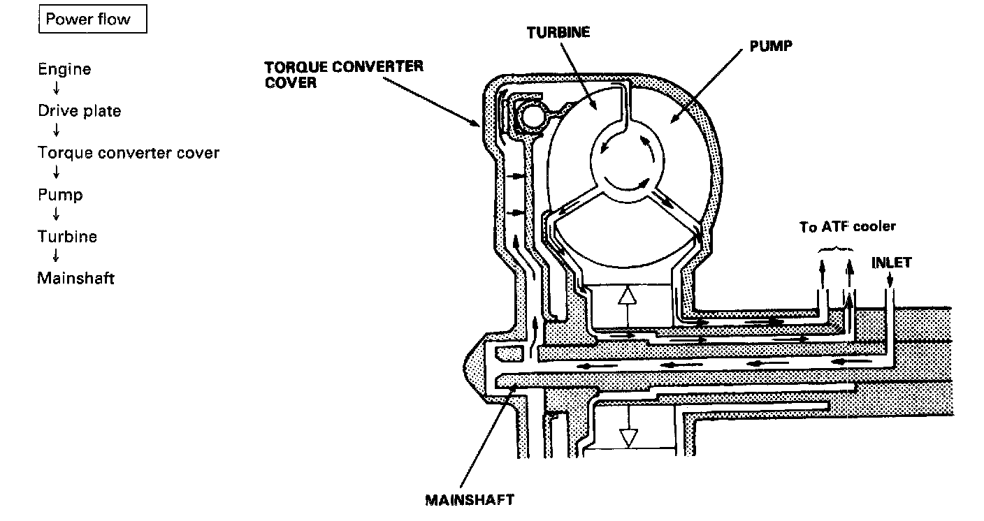 With the lock-up clutch on, the fluid in the chamber between the torque converter cover and the lock-up piston is drained off, and the converter fluid exerts pressure through the piston against the torque converter cover. As a result, the converter turbine is locked to the converter cover. The effect is to bypass the converter, thereby placing the vehicle in direct drive.