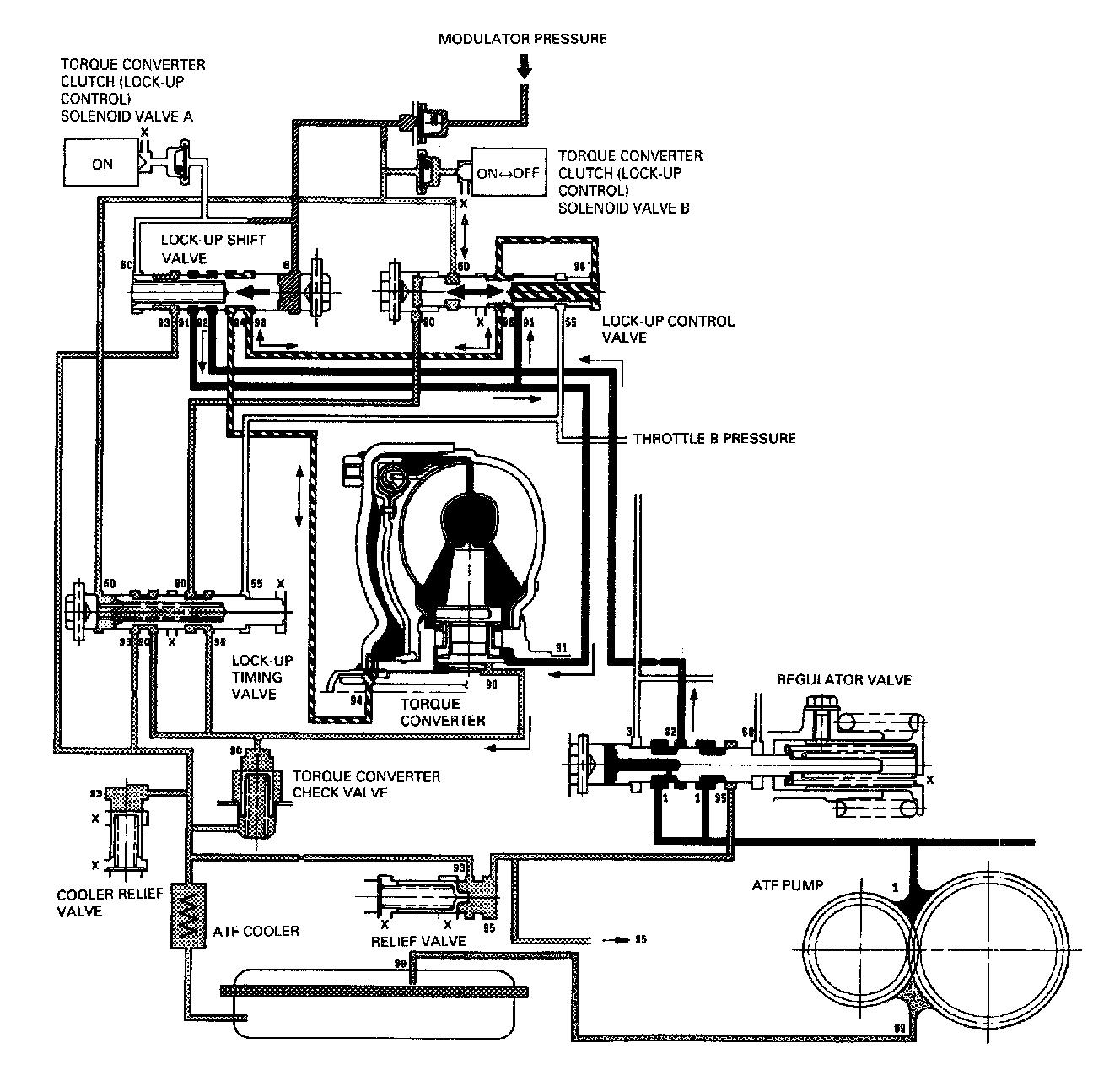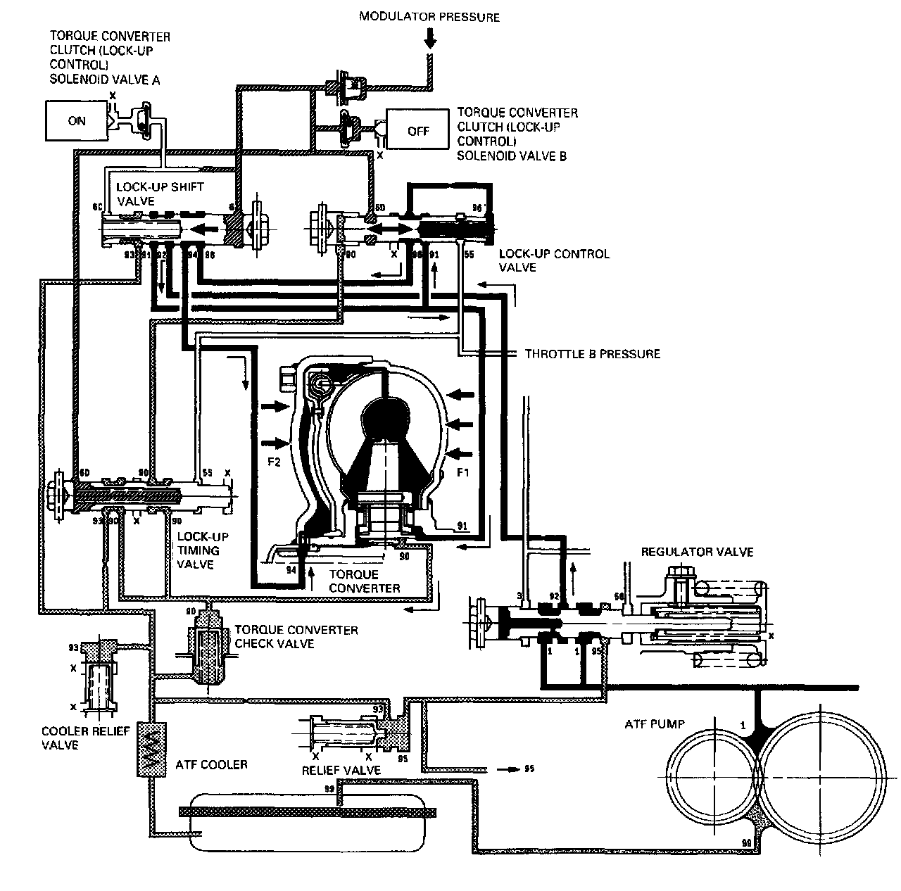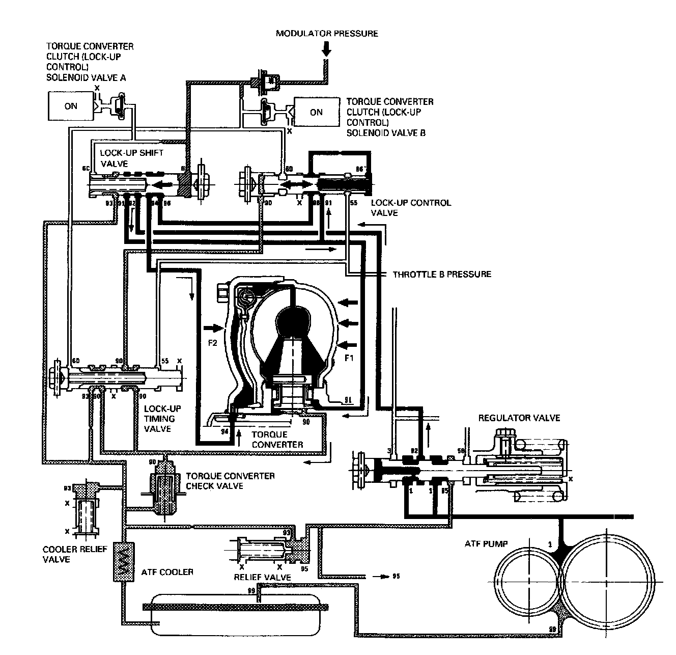 The lock-up system controls the range of lock-up according to torque converter clutch (lock-up control) solenoid valves A and B, and the throttle valve. When torque converter clutch solenoid valves A and B activate, modulator pressure changes. Torque converter clutch solenoid valves A and B are mounted on the torque converter housing, and are controlled by the PCM.