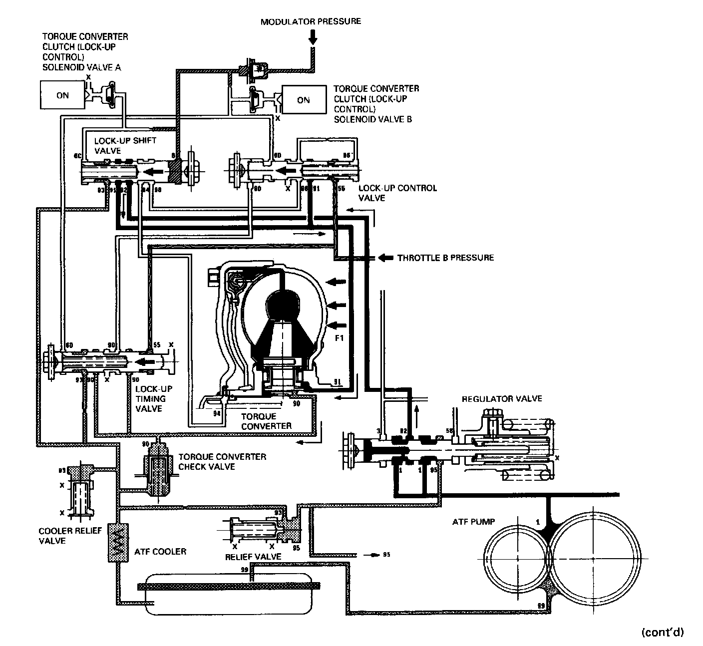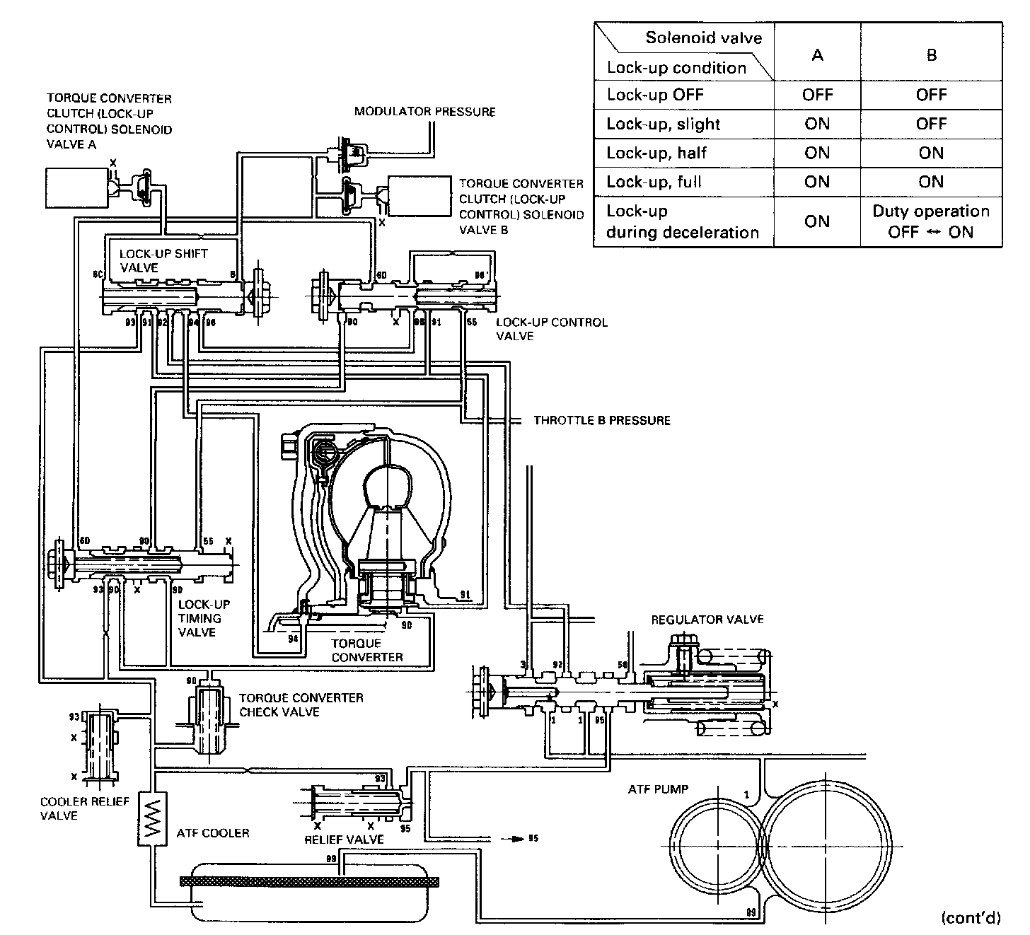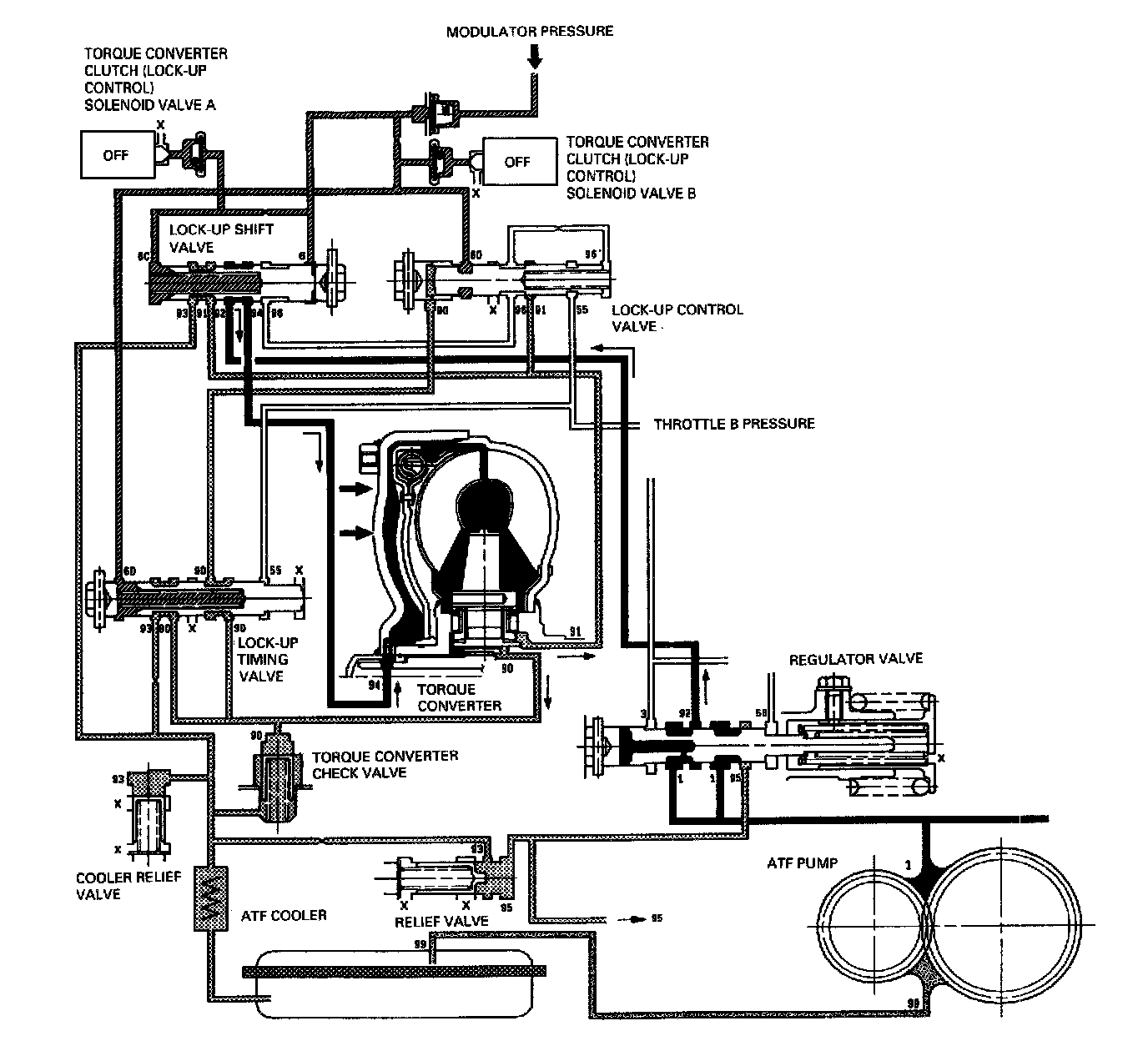 The lock-up system controls the range of lock-up according to torque converter clutch (lock-up control) solenoid valves A and B, and the throttle valve. When torque converter clutch solenoid valves A and B activate, modulator pressure changes. Torque converter clutch solenoid valves A and B are mounted on the torque converter housing, and are controlled by the PCM.