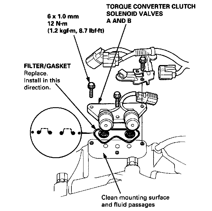 2. Clean the mounting surface and fluid passages of the torque converter clutch solenoid valves A and B, and install a new torque converter clutch solenoid valves A and B with a new filter/gasket.