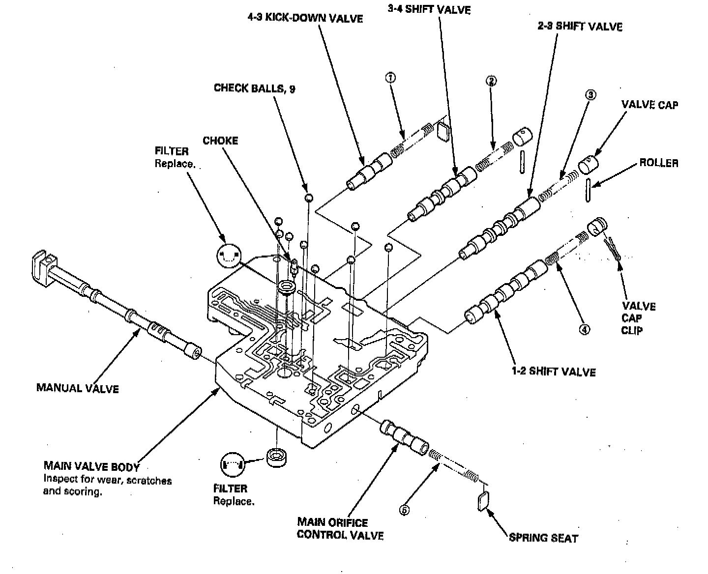- Check all valves for free movement. If any fail to slide freely, see Valve Body Repair.