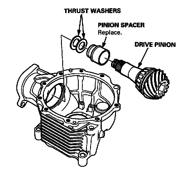 14. After adjusting the ring gear tooth contact, remove the drive pinion, then install a new pinion spacer and thrust washers on the drive pinion.