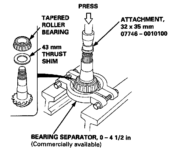 12. Remove the tapered roller bearing and 43 mm thrust shim using a press as shown.
