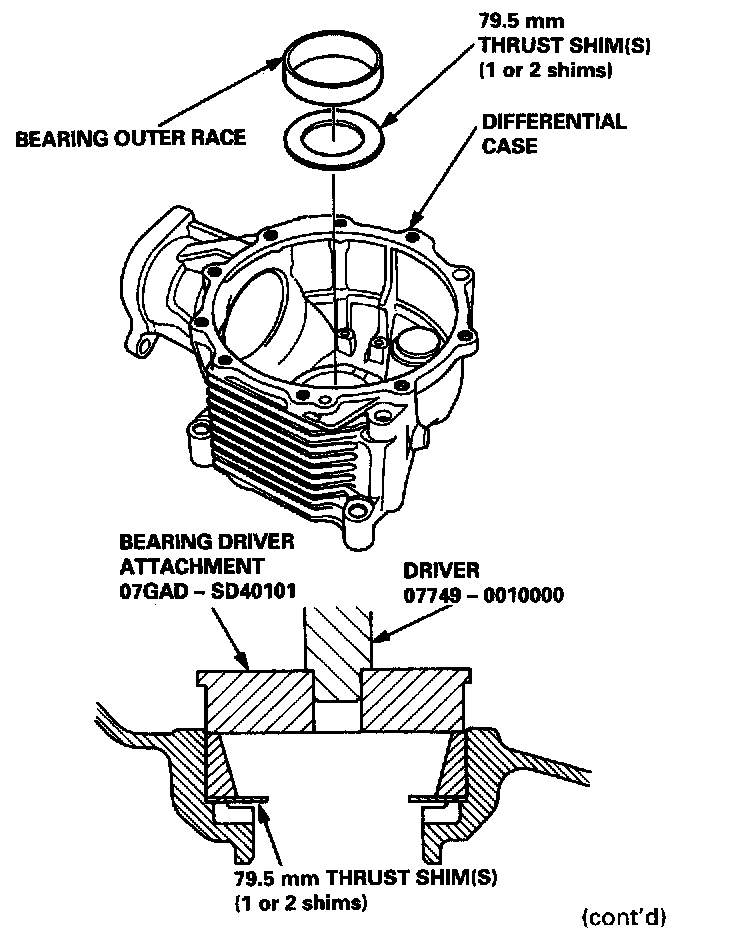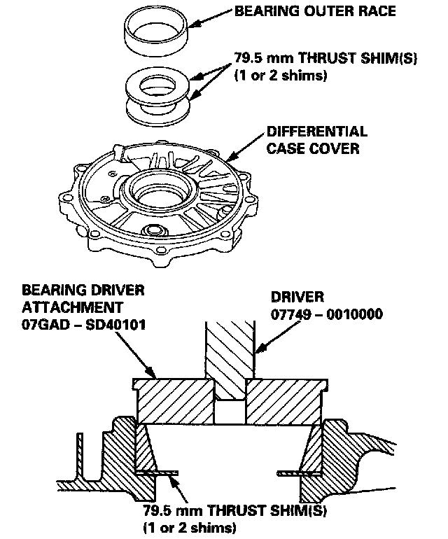 3. Remove the bearing outer race and the 79.5 mm thrust shim(s) from the differential case cover by heating the differential case cover to about, 212°F (100°C).