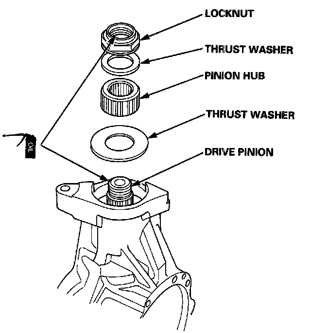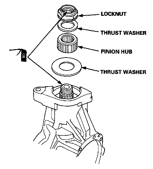 7. Install the large thrust washer, pinion hub, small thrust washer, and a new locknut.